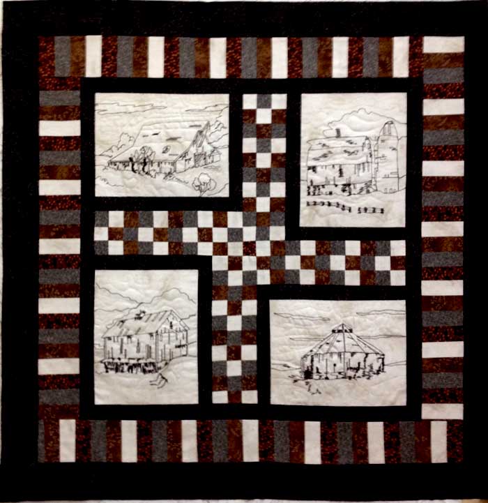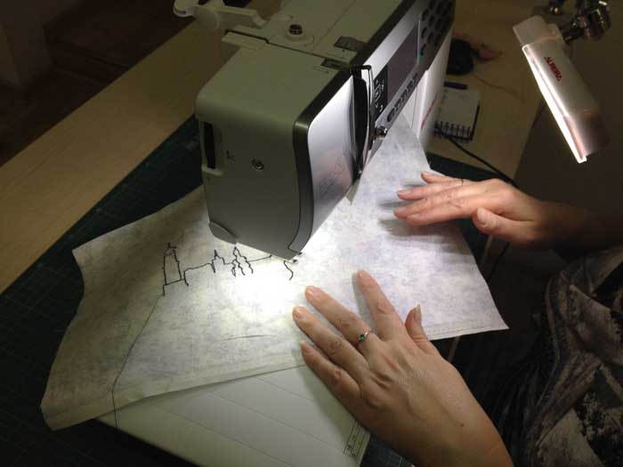 В этом стиле обычно изображаю силуэты городов и пейзажей. И вот рисунок был выбран, и затем приступили к творческому процессу. Перенесли рисунок на ткань с помощью кальки, далее выбрали в машине функцию тройной строчки и выполнили вышивку ручным приемом. Прошлись этой строчкой по всем контурам рисунка и готово. Стильно!?