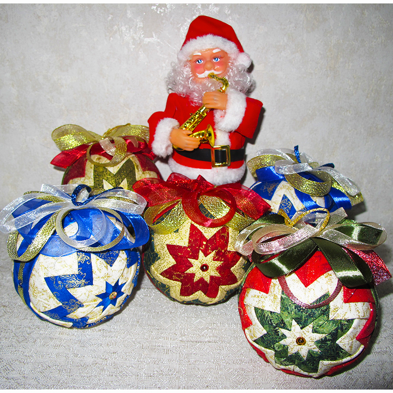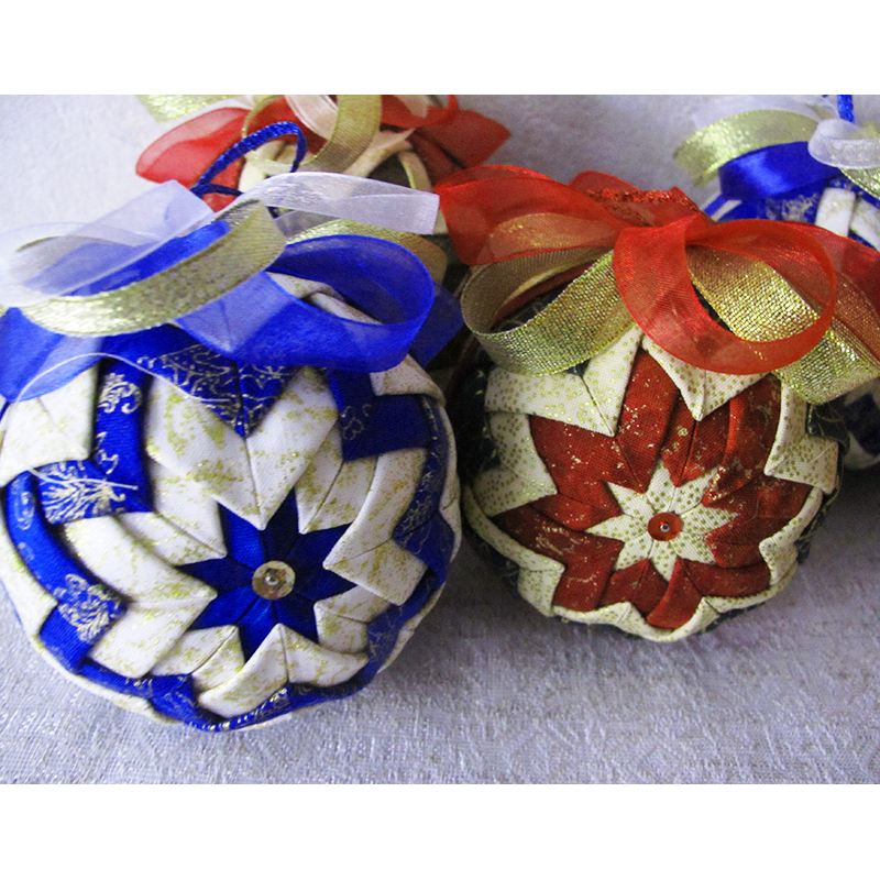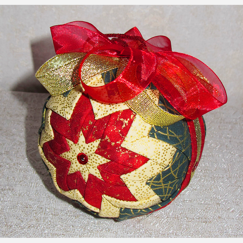 Шар выполнен из специальных тканей для пэчворка на пенопропиленовой основе. Декорирован лентами и пайетками, имеет подвес. Диаметр готового шара 10 см.