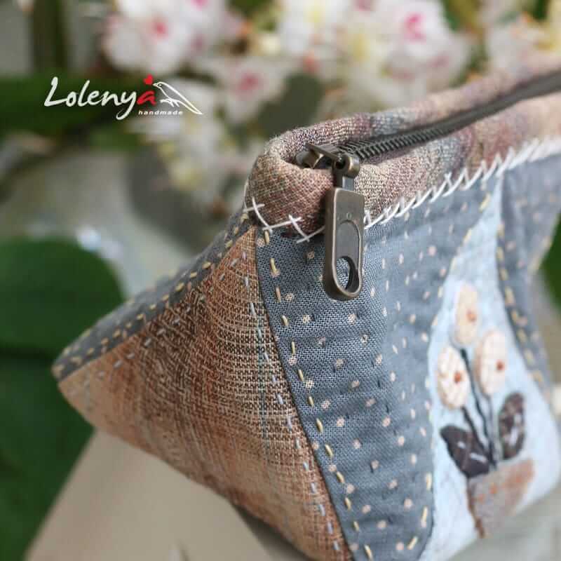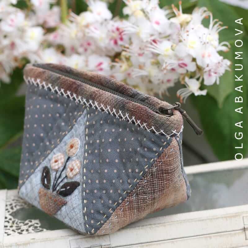 Раскрой деталей косметички в форме трапеции "Окно возможностей". Изготовление ручной аппликации и сборка лоскутного блока. Оформление вышивкой и ручная стежка деталей.